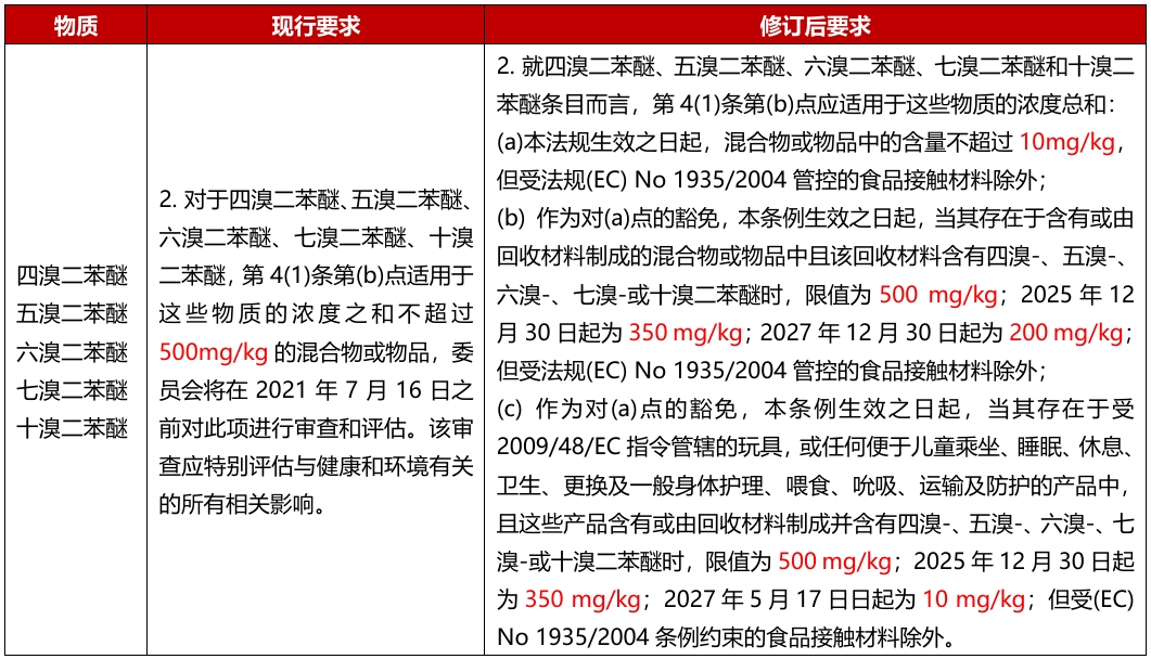 2025年10月28日,欧盟在其官方公报(OJEU)发布了修订法规(EU) 2025/1482,修订欧盟持久性有机污染物(POPs)法规(EU) 2019/1021,进一步收紧了POPs法规附录I的A部分中多溴二苯醚(PBDEs)的限值要求。该修订法规已于2025年11月17日生效。