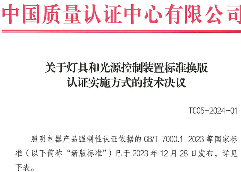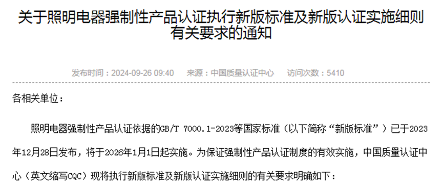 照明电器强制性产品认证依据的GB/T 7000.1-2023等国家标准(以下简称“新版标准”)已于2023年12月28日发布,将于2026年1月1日起实施,2024年9月26日中国质量认证中心(CQC),发布标准换版通知详见官网链接:https://www.cqc.com.cn/www/chinese/c/2024-09-26/597598.shtml