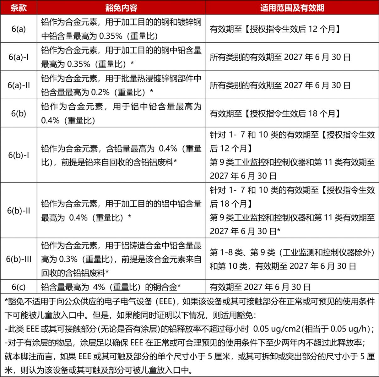 关于钢合金、铝合金和铜合金,RoHS指令附录III的6(a), 6(a)-I, 6(b), 6(b)-I, 6(b)-II 和 6(c) 条款被替换为以下内容: