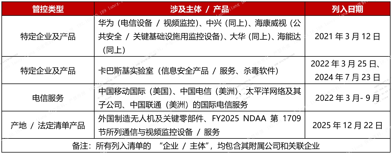 • 清单属性:新增内容与华为、中兴、海康威视等此前被列入的企业/产品并列,属于“对美国国家安全或公民安全构成不可接受风险” 的管控范畴。