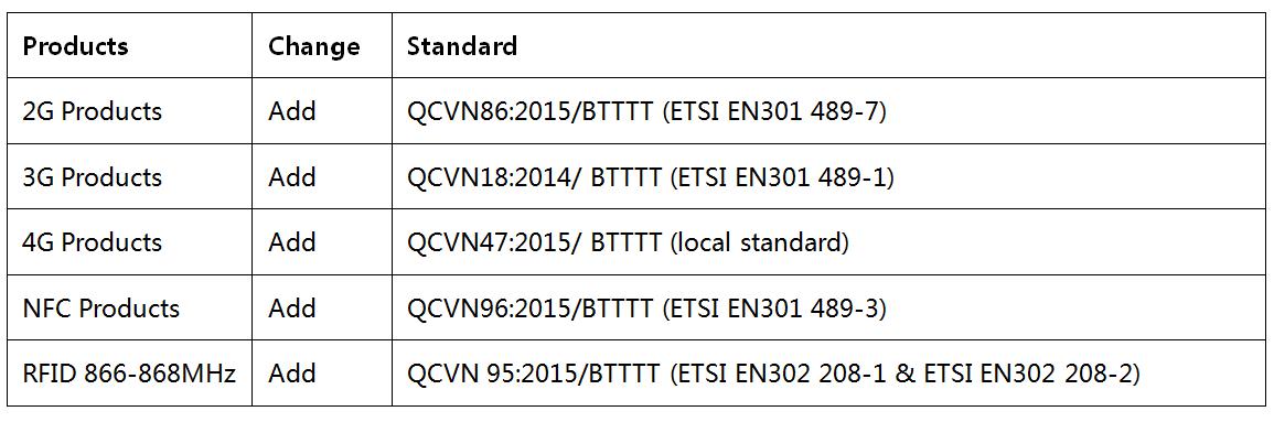 Vietnam (MIC) 2G/3G/4G/NFC/ RFID product new standards