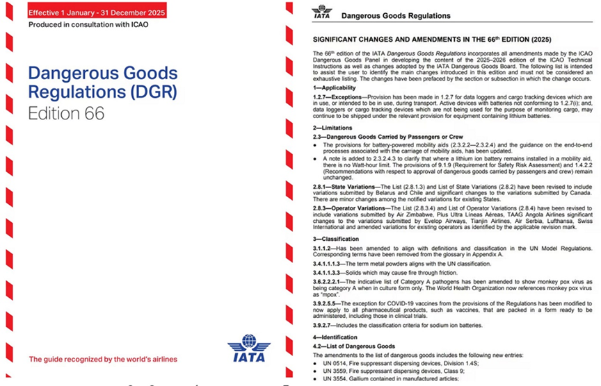近日IATA(国际航空运输协会)发布了第66版DGR(危险品规则),从2025年1月1日起,第66版IATA危险品条例(DGR)和第12版锂电池运输条例(LBSR)正式生效。