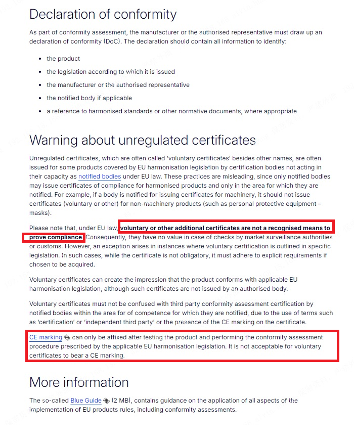 欧盟委员会在官网上强调了关于产品符合性评估的具体要求,特别指出了自愿性证书中不得使用“certification”、“independent third party”等字样,且严禁出现CE标志。